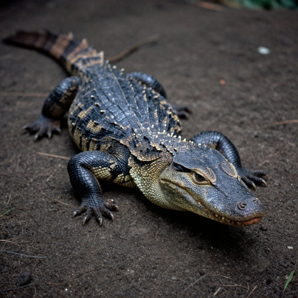 A photography of a (Zonkey:Caiman Lizard:0.55), landscape with Rough Texture, hybrid creature, National Geography Award winning photography, breathtaking, 2000s vintage RAW photo, photorealistic, film grain, candid camera, color graded cinematic, eye catchlights, atmospheric lighting, imperfections, natural, shallow dof, High level of detail to create a photographic-like image, focusing on lighting, realistic textures, hyperdetailed.