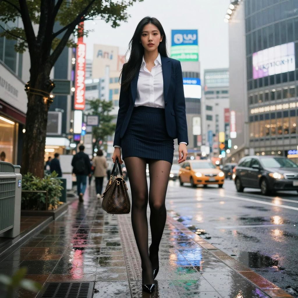 A young Asian female flight attendant with black hair, dressed in a dark blue uniform with gold trim, white pantyhose, and a striped neck scarf. She is sitting with crossed legs on a gray airport lounge chair, smiling and looking at the camera. The background features a modern airport seating area with muted colors and soft ambient lighting.