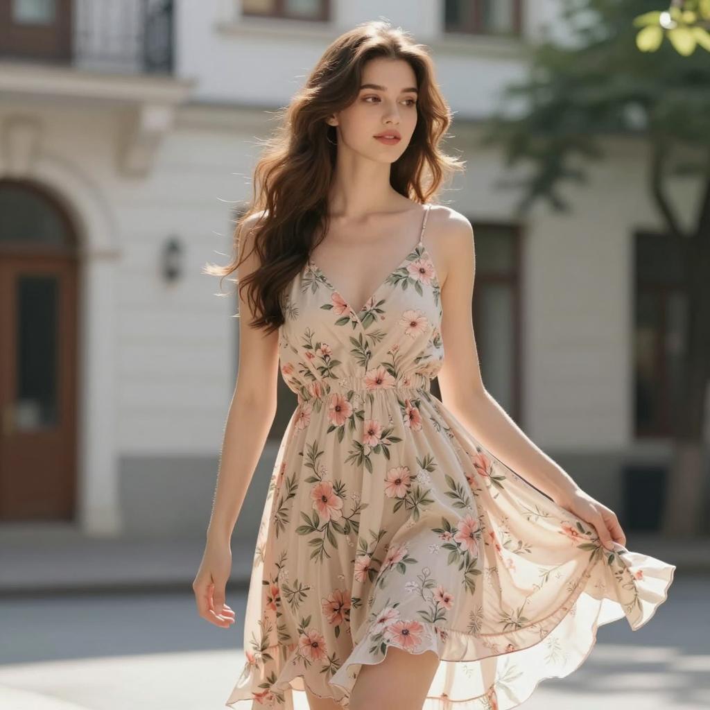 Young Woman in Pink Floral Dress on Historic Street