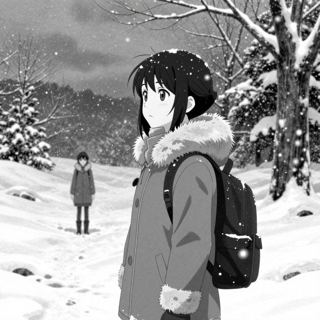 The image is a black and white anime manga panel, depicting a young girl standing in a snowstorm. She is wearing a fur-lined coat and a backpack, with her hair tied back. The girl is looking off to the side, lost in thought. In the background, there is another figure, possibly a woman, standing in the distance. The scene is set in a snowy landscape with trees and bushes covered in snow. The sky is filled with falling snowflakes, creating a sense of depth and movement. The overall composition is balanced, with the girl in the foreground and the other figure in the background, creating a sense of scale and perspective. The interplay of light and shadow adds to the dramatic effect, highlighting the girl's expression and the falling snow.