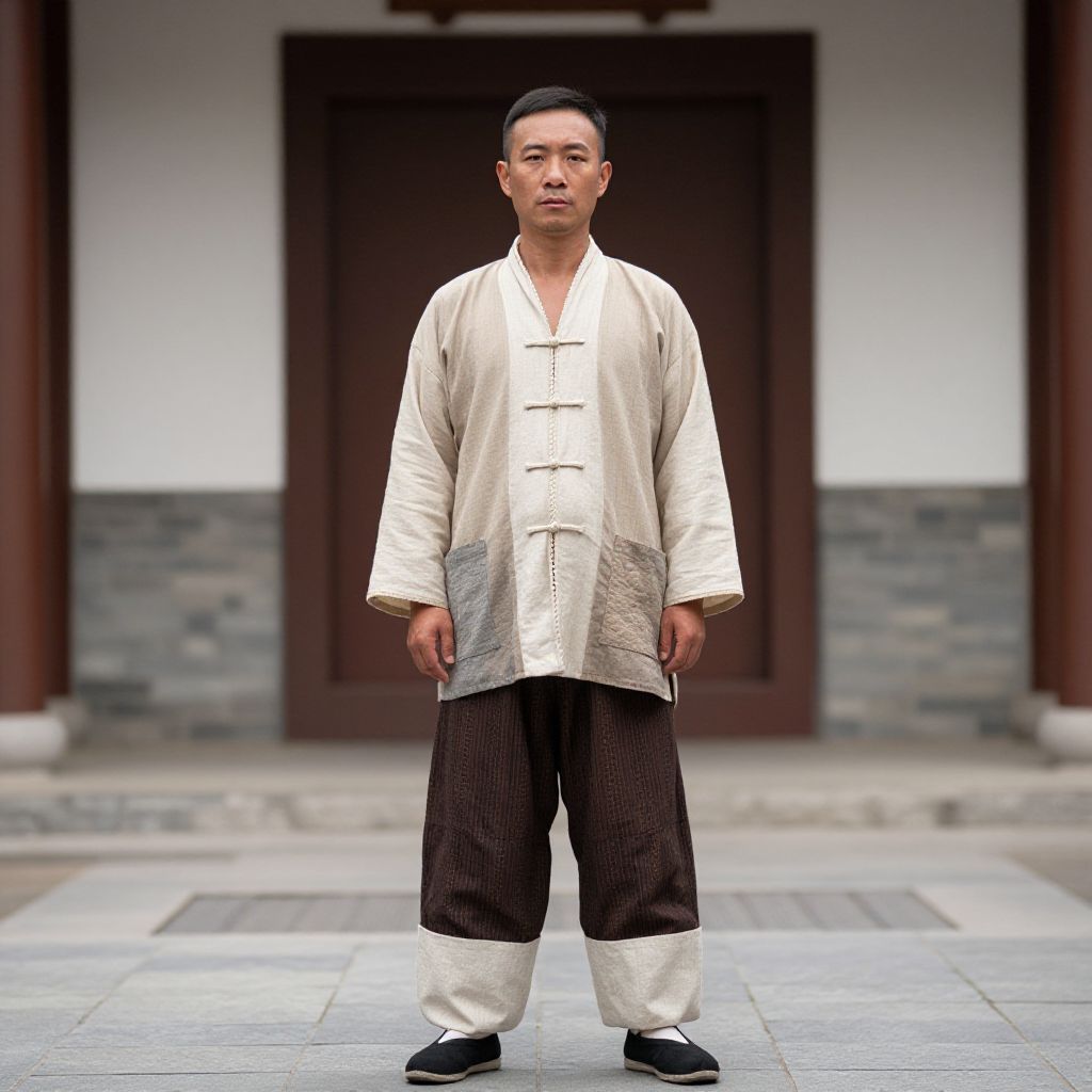 "Traditional Chinese Peasant Clothing, man in a traditional chinese dress standing in front of a building"