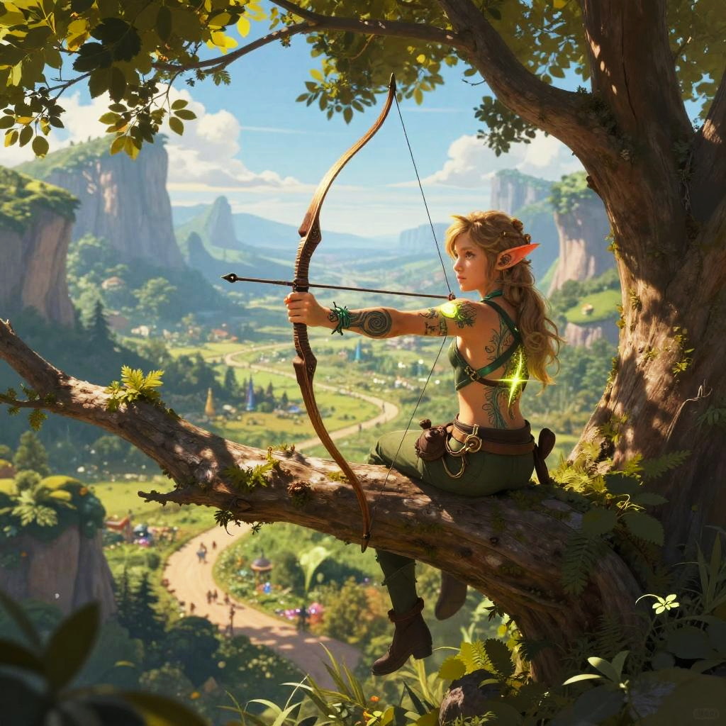 In a vibrant, digital fantasy artwork, a blonde, elf-like archer with pointed ears, long wavy hair, and green eyes sits on a large, sunlit tree branch. She wears a green, sleeveless, leather top with black pants, a belt with a sheath, and black boots. Her right arm, adorned with a tattoo, draws a bow aimed at the distant valley below. The background features a lush, rolling landscape with towering cliffs, a winding path, and tiny, colorful figures. Sunlight filters through the dense, green foliage, casting dappled shadows. The scene exudes a sense of serene focus and natural beauty.