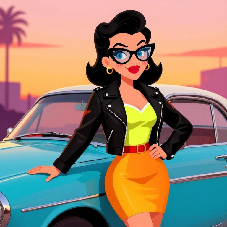 Cartoon pin up styled with retro rockabilly fashion, leather jacket over bright dress with cat-eye glasses, standing by a vintage car at sunset, glossy and vibrant color palette, playful and confident expression with clean bold outlines and stylized background elements.