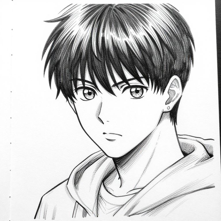 Black-and-white manga-style drawing of a young man with short, messy dark hair, large eyes, and a serious expression, wearing a hooded shirt