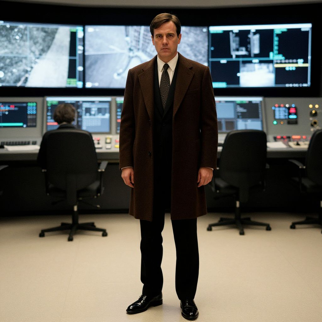 A man, classic black suit, ivory dress shirt, subtle patterned tie, rich brown wool overcoat, shiny black derby shoes, high-tech control room, large screens with satellite imagery, focused expression, ib technicolor film stock. Man has masculine face and piercing eyes