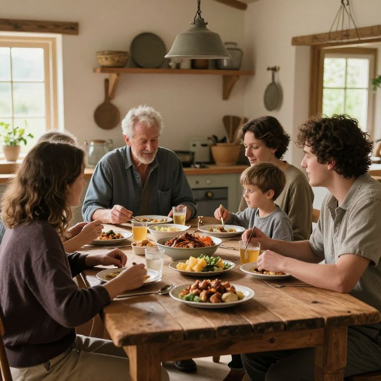 Kin gathered around a rustic wooden table in a sunlit countryside kitchen, sharing a hearty meal, warm and intimate atmosphere, soft natural lighting, detailed textures of food and expressions, cozy family scene in a traditional setting