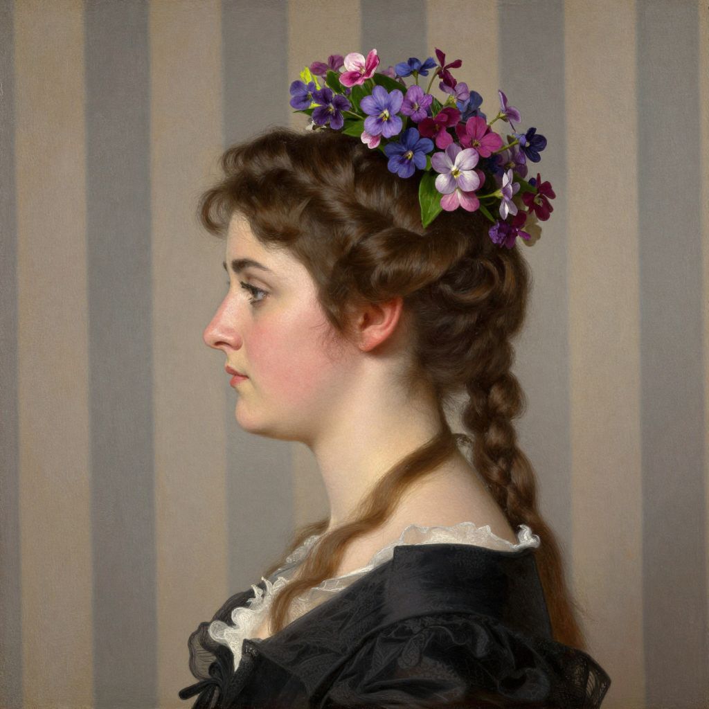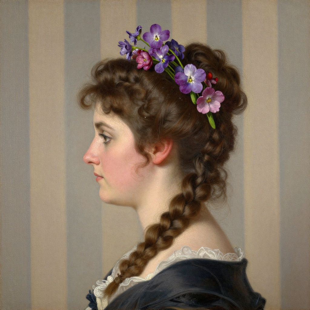 Portrait of a woman by William Worchester Churchill (1858-1926), featuring her elegant profile adorned with a vibrant nosegay of violets in her intricately styled hair, set against a striped background.