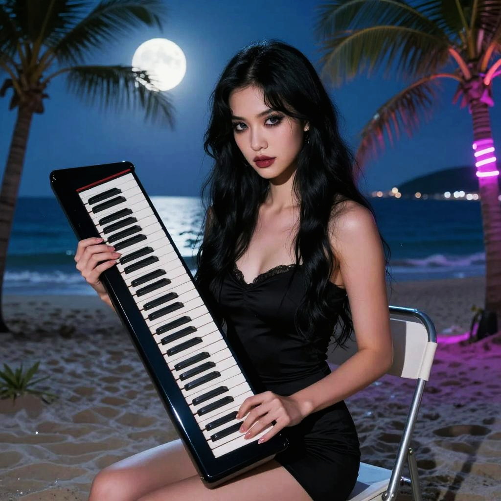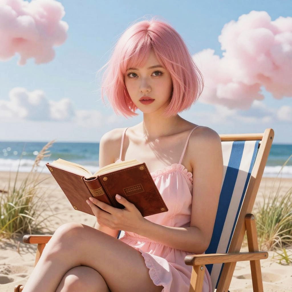 Masterpiece portrait of a beautiful graceful platinum blond contemporary artist girl holding a paint palette and sitting on a beach chair at a Mediterranean beach, surrounded by scattered beach rocks and a pastel sunset, cinematic lighting, highly detailed, beautiful eyes, pretty face, symmetry, sharp focus, illustration, inspired by Moebius, Wendy Melvoin, Ross Tran
