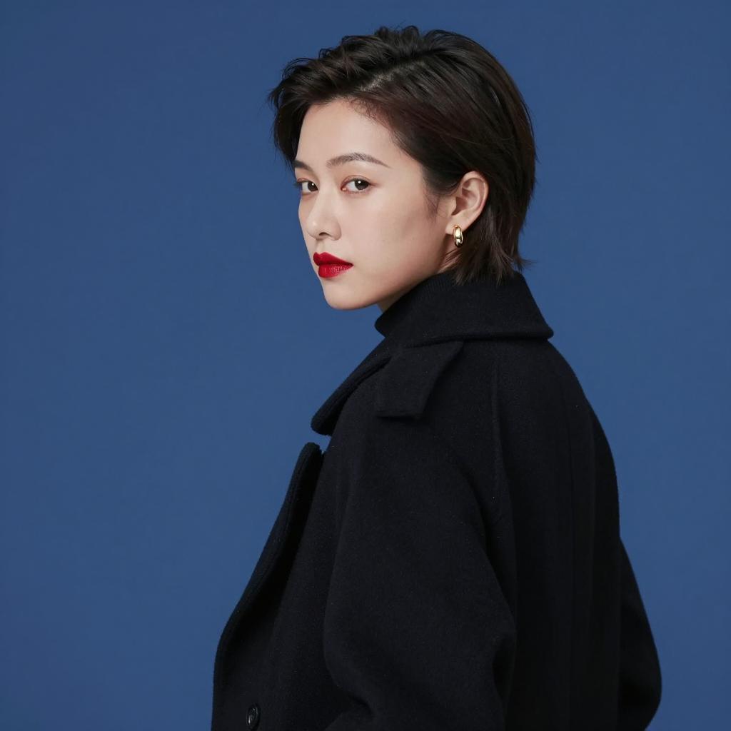 Photograph of a person with short dark hair, intense gaze, wearing a black long-sleeve shirt, aiming a handgun with both hands. Warm, orange-red light background. Person is sitting with knees up. Handgun is held straight ahead.