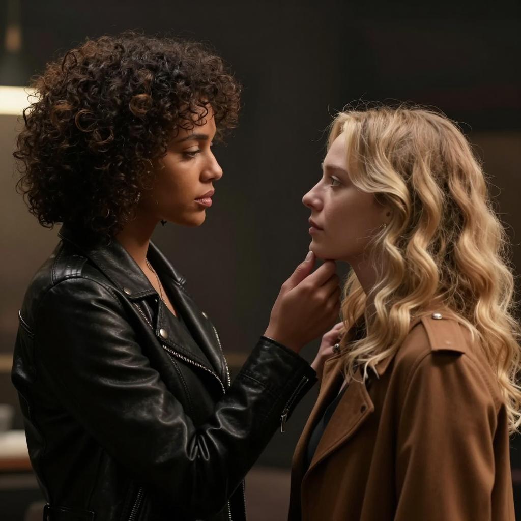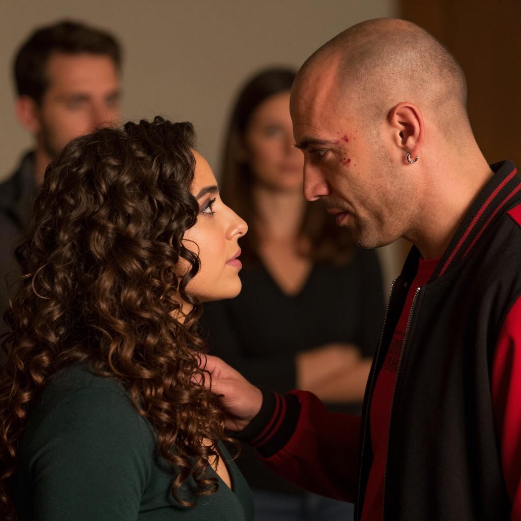 A close-up scene. A bald man with a scar and earring, wearing a black and red jacket, leans in towards a woman with dark curly hair, wearing a green top. Both look intently at each other. Two blurred figures in the background. Warm, dim lighting.