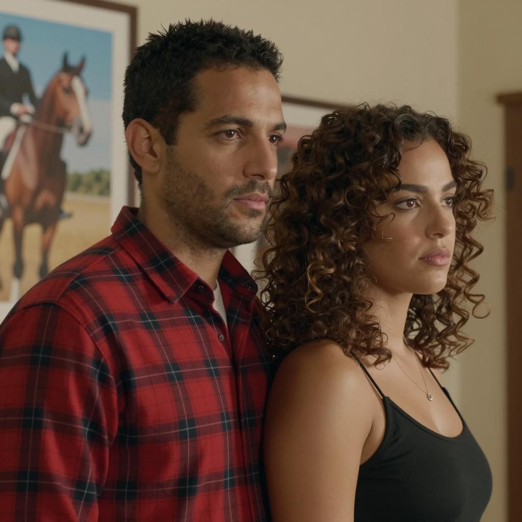 Close-up of a bald man with a scar and earring wearing a black and red jacket and a woman with dark curly hair wearing a green top, facing each other intensely. Two blurred figures stand in the background. Warm, dim lighting enhances the dramatic atmosphere.