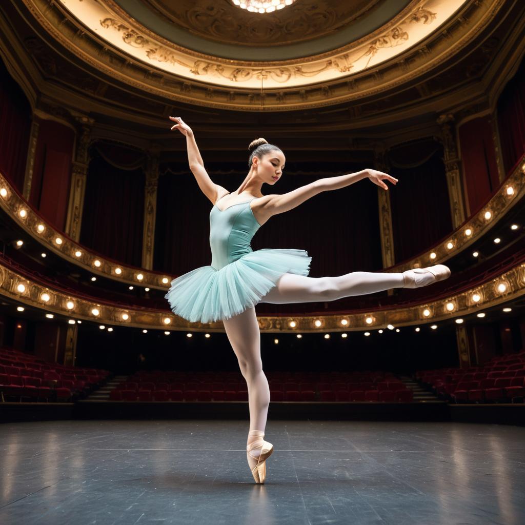Wide-angle full-body shot of a female ballet dancer posing elegantly on a wooden stage in a classic theater. She wears a light green tutu and pointe shoes, her hair styled in a sleek bun. The background features ornate theater architecture with lit balconies and red curtains, evoking a traditional performance ambiance.