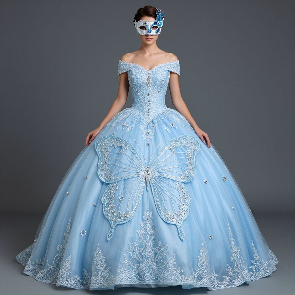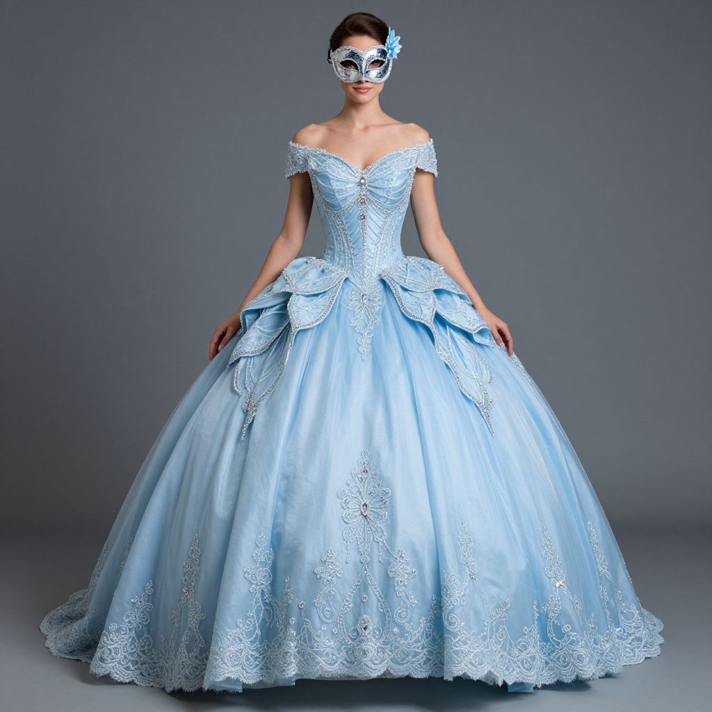 Photograph of a slender, light-skinned woman with dark hair, wearing an off-the-shoulder, light blue, lace-embellished ball gown with a voluminous skirt and a large bow at the waist. She also wears a matching blue masquerade mask with intricate designs. Her hands rest gracefully on her sides. The background is a simple, solid gray, allowing the elegant gown and mask to be the focal point. The gown's delicate lace patterns add texture and contrast to the smooth, satin-like fabric. The overall style is reminiscent of a fairy tale or ballet.