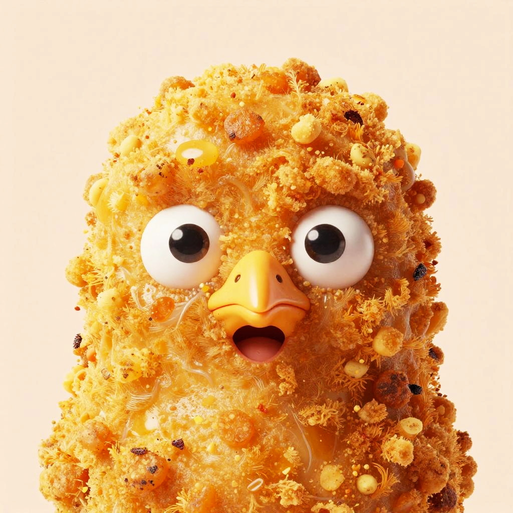 Close-up portrait of a chicken nugget human with crunchy golden skin, detailed textures of breading and spices, expressive human eyes and mouth, set against a soft pastel background, surreal and quirky art style with fine shading.