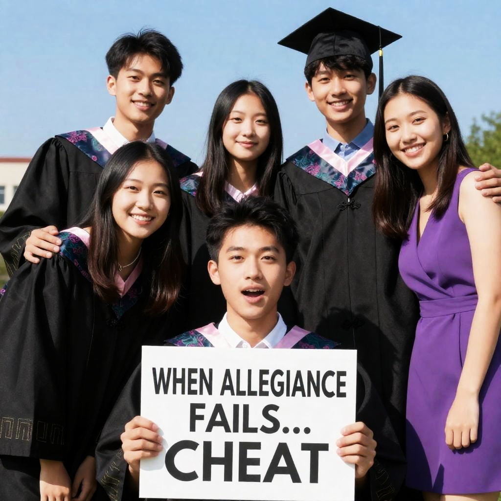 Group of six young adults in graduation attire, outdoors with a blue sky. Five smiling, one with mouth open. Man in front holds sign reading "WHEN ALLEGIANCE FAILS... CHEAT." Girl in purple dress on right, cap on boy's head, arm around girl. Bright sunlight.