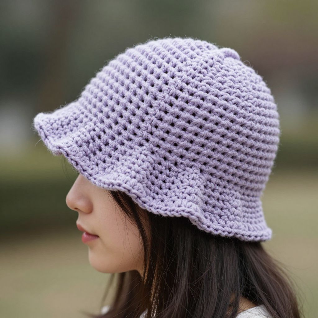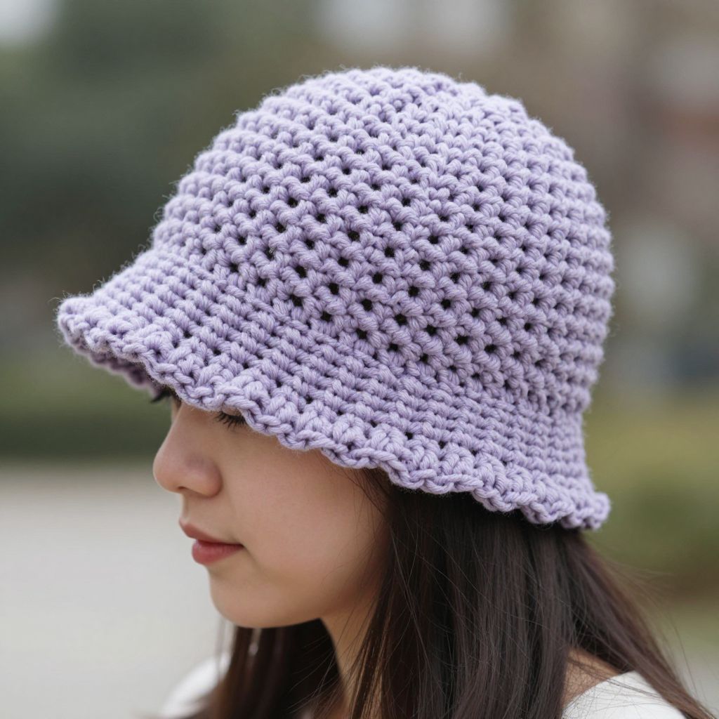 Woman wearing a handmade, lavender-colored crochet cloche hat featuring a textured pattern and brim, set against a blurred outdoor background.