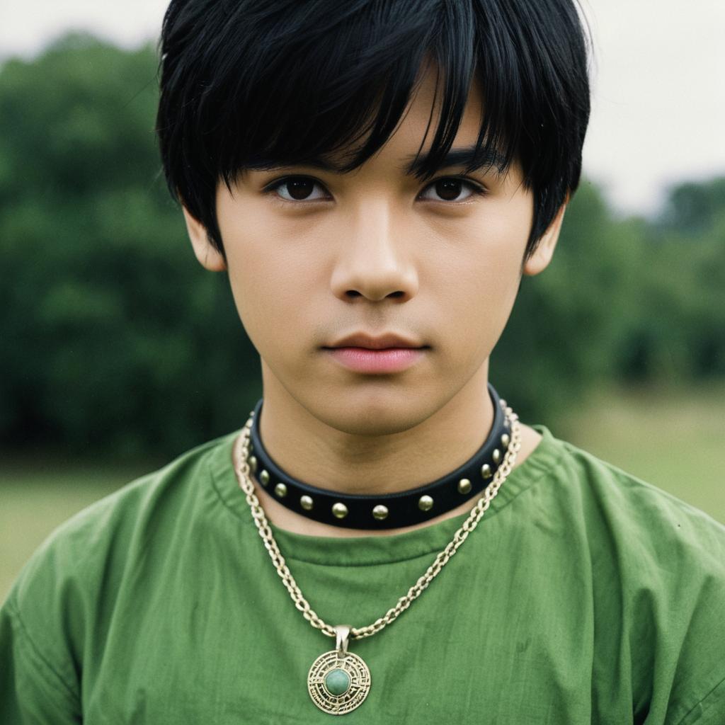 Close-up portrait of a young Asian man with short black hair wearing a green tunic and two necklaces, one of which is a studded black choker, standing outdoors with a blurred green natural background. The man has a neutral expression and is looking directly at the camera.