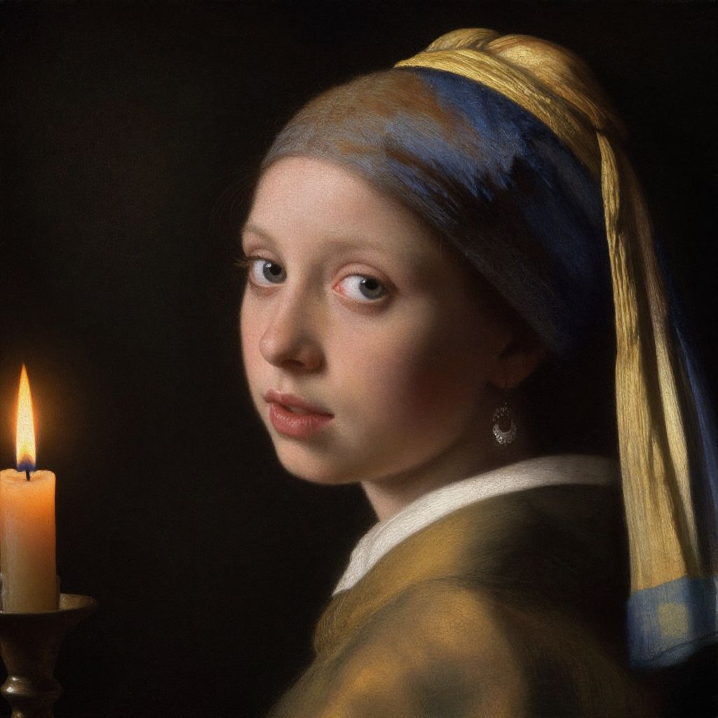 An elaborate oil painting in a style reminiscent of Rembrandt's masterful technique, this artwork presents an intimate scene from the perspective of a small creature nestled within the luxurious folds of a rich velvet curtain. Candlelight flickers across the faces of three enigmatic figures, their expressions shifting between curiosity and intrigue under the soft glow. The interplay of light and shadow on their features creates a captivating gradient that intensifies the dramatic atmosphere, drawing the viewer into this close yet cryptic gathering where secrets seem to hang in the air like gossamer threads.