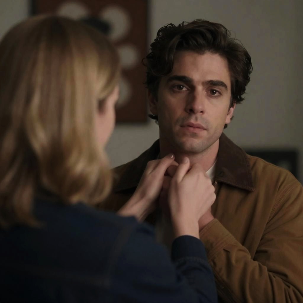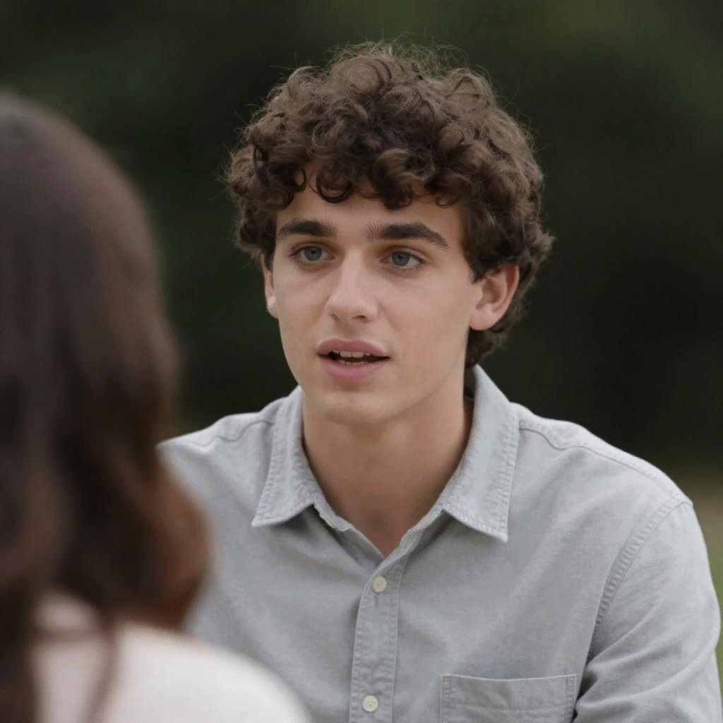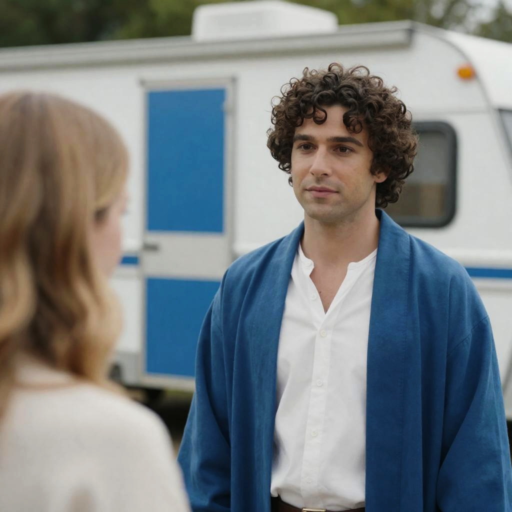 Photograph of a man with curly brown hair, wearing a blue robe over a white shirt, standing in front of a white trailer with a blue panel. He faces a woman with blonde hair, partially visible from the back. He has a neutral expression. Background includes a tree.