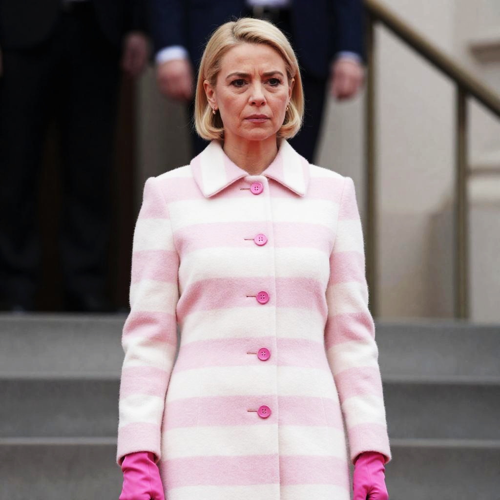 Photograph of a woman with short blonde hair, wearing a pink and white striped coat with buttons, pink gloves, standing on stairs. She has a serious expression. Background shows blurred people and staircase railing.