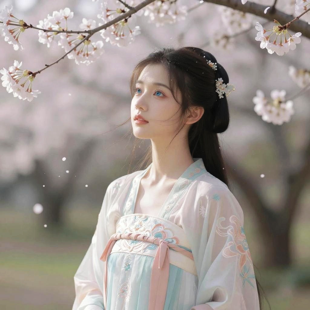 Portrait of a Chinese girl with blue eyes standing in a blooming cherry blossom garden. She is wearing a traditional silk dress featuring intricate embroidery in soft pastel colors. Delicate cherry blossom petals gently fall around her as soft sunlight casts a gentle glow, creating a serene and mystical atmosphere.