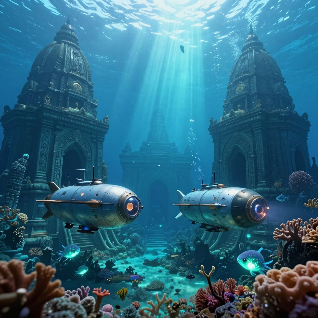 Midjourney themes represented as an underwater exploration, where ancient sunken temples meet advanced submarines, glowing sea creatures swimming through coral reefs, beams of light filtering from the surface, a sense of wonder and discovery expressed through rich blue and turquoise tones.