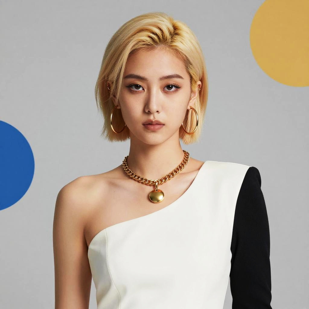 Platinum blonde buzz cut on a fashion-forward person in avant-garde outfit, surreal art background with abstract shapes, bold makeup, and metallic jewelry