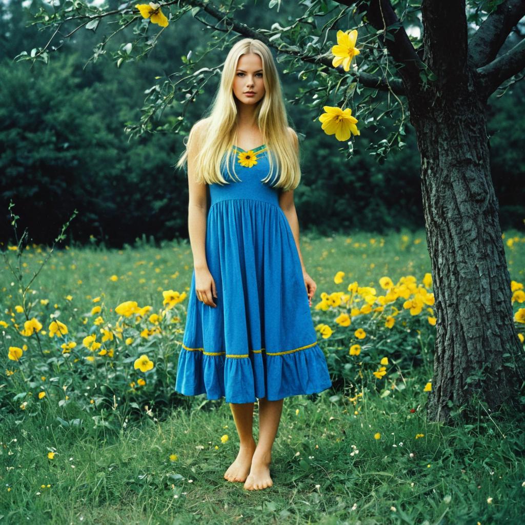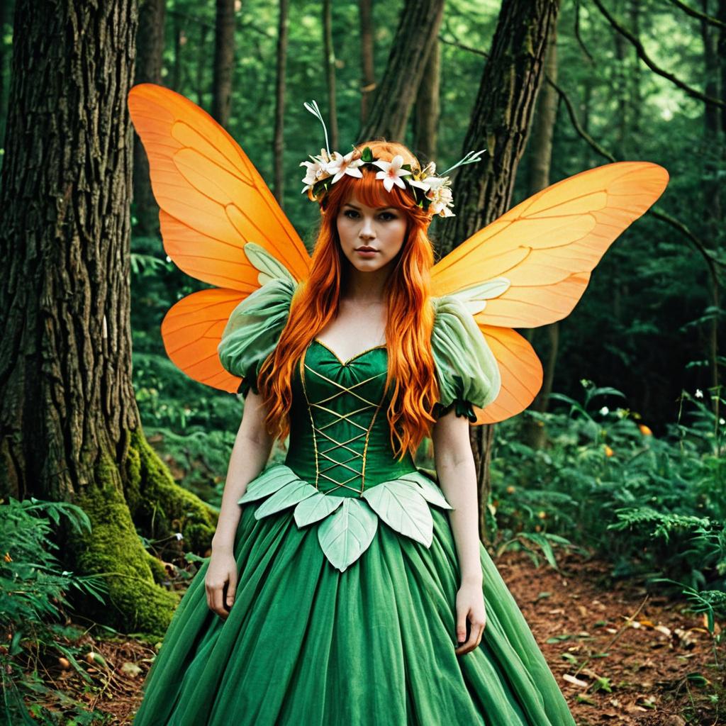 A young woman with long brown hair wearing a flowing green dress and a flower wreath on her head stands barefoot in a dense forest. She holds the hem of her skirt while posing next to a large tree trunk, surrounded by lush greenery and natural woodland.