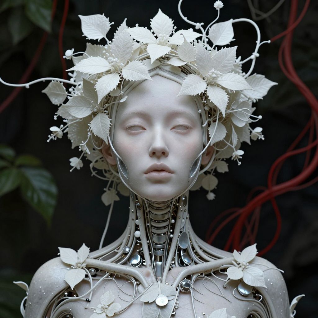 A digital artwork depicting a pale, ethereal humanoid figure with a metallic, robotic neck and shoulders. The figure's face is smooth and featureless, with closed eyes and a neutral expression. They wear a crown of white, leaf-like flowers that contrast with their silver, mechanical body. The background is dark and shadowy, with faint, red, vine-like patterns. The overall style combines elements of cyberpunk and fantasy, with a surreal, otherworldly atmosphere. The figure's delicate, leaf-adorned appearance contrasts sharply with the intricate, mechanical design of their neck and shoulders.