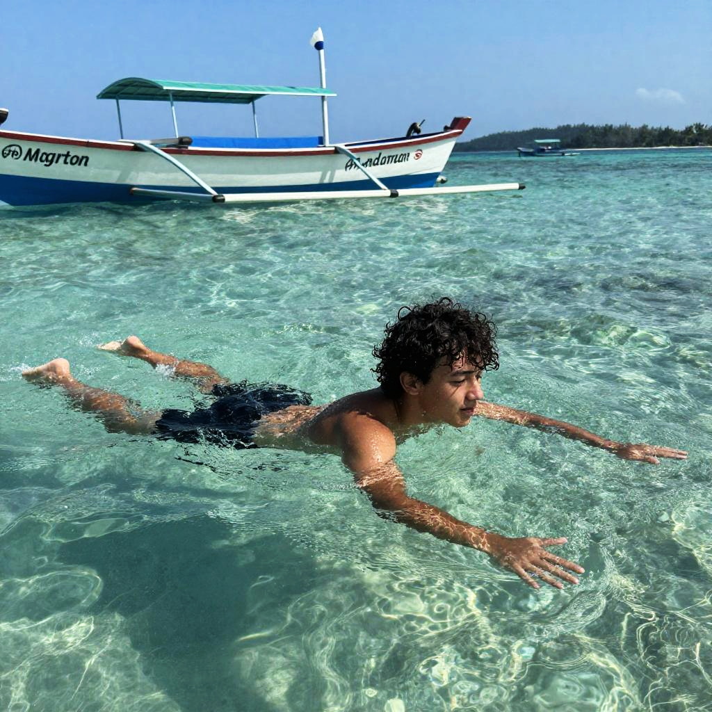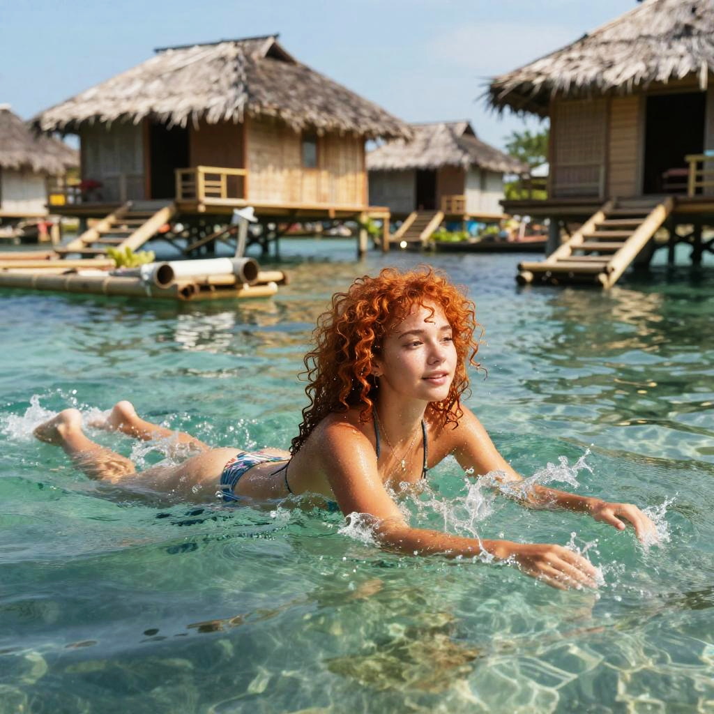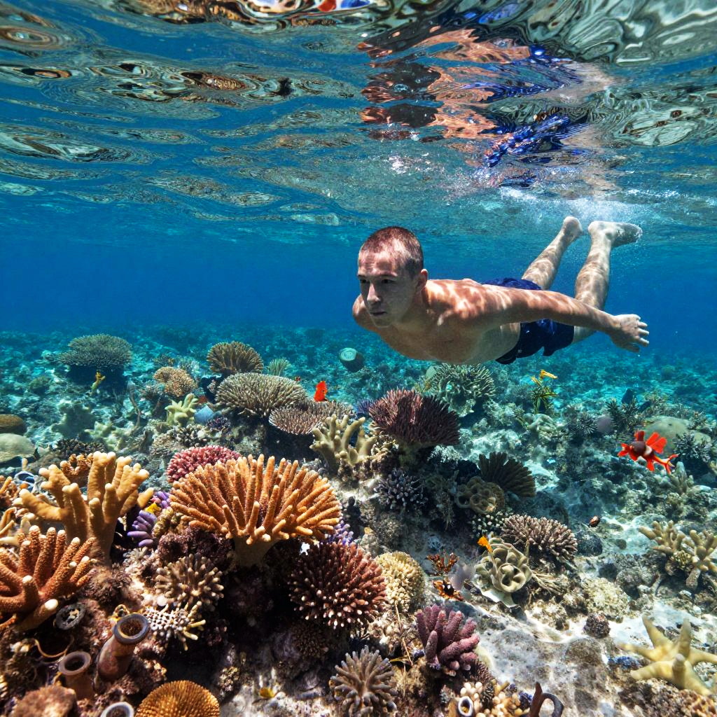 Young diver with buzz cut swimming near colorful coral reefs on a sunny day, evoking a serene holiday atmosphere. Set in the Coral Sea, the scene captures high-quality, vibrant tropical colors with crystal-clear waters and sunlight filtering through, creating a beautiful and tranquil vibe. The diver's haircut sharp and clearly visible underwater as he moves gracefully through the water, enhancing the sense of leisure and paradise. The overall composition is both relaxing and visually captivating, embodying the essence of a Pacific holiday.