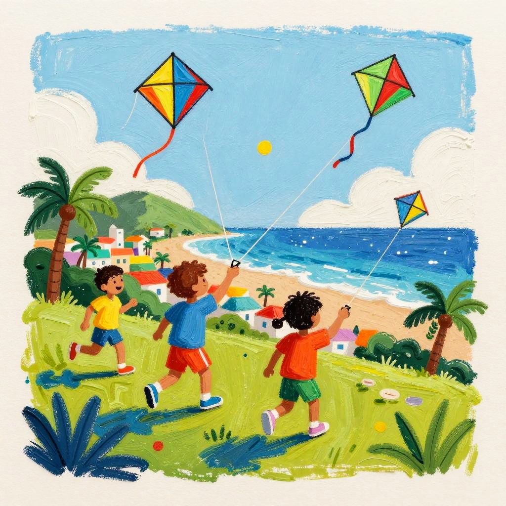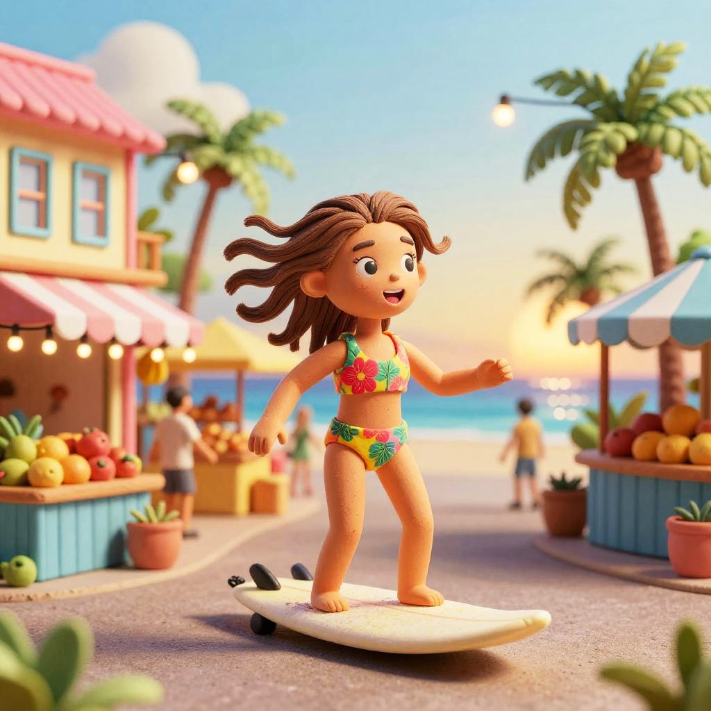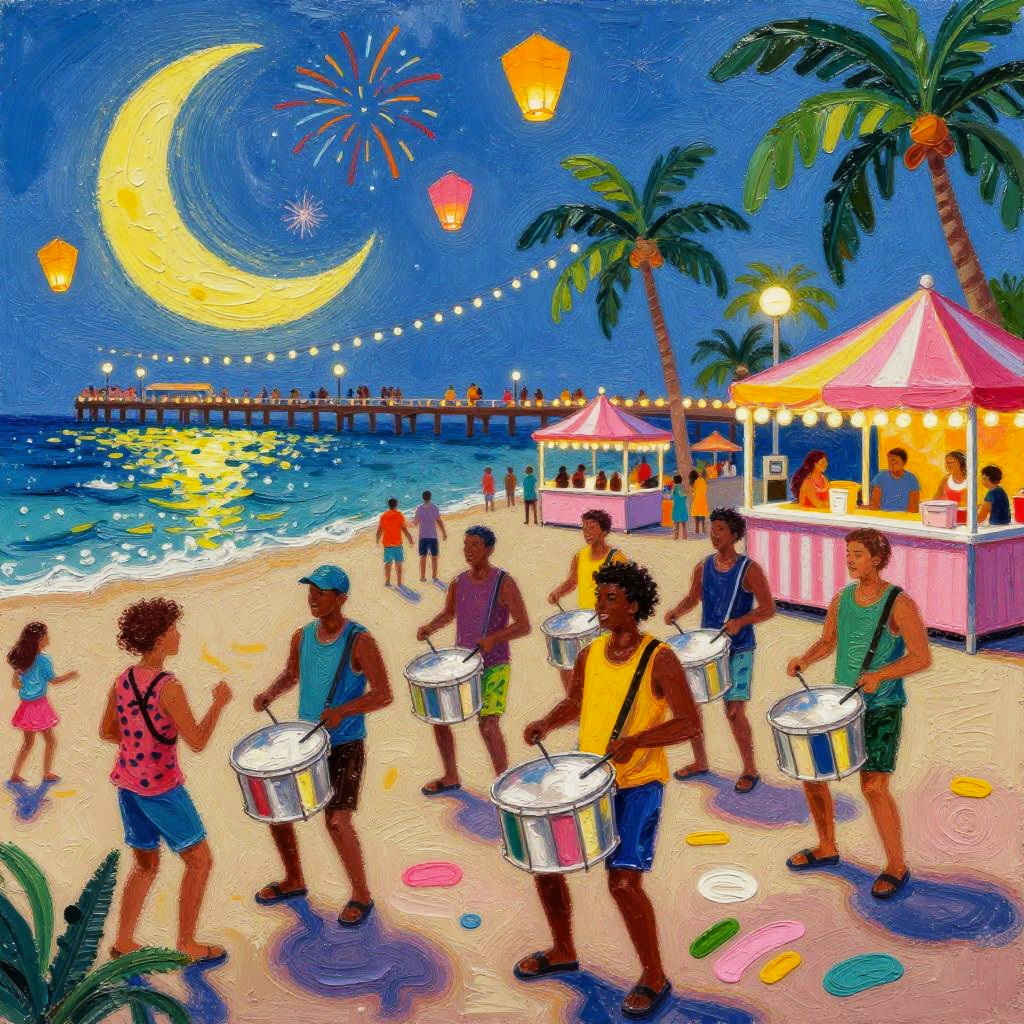 Sunset pastel gouache with metallic leaf accents, bold ink outlines and subtle paper texture, contemporary editorial flair, SDXL-ready depiction of a smiling woman with long braided hair set in a makeshift seaside boardwalk stage at dusk framed by palm-thatched stalls and painted fishing nets, lanterns swaying, tide-glittered sand and distant ferry lights on a sparkling ocean horizon, celebrating Caribbean color and rhythm with saturated hues, bold shapes, joyful expressions, palm silhouettes, ocean sparkle, playful motion, crisp outlines, soft shadows, modern editorial flair, high detail, balanced composition, SDXL-ready.
