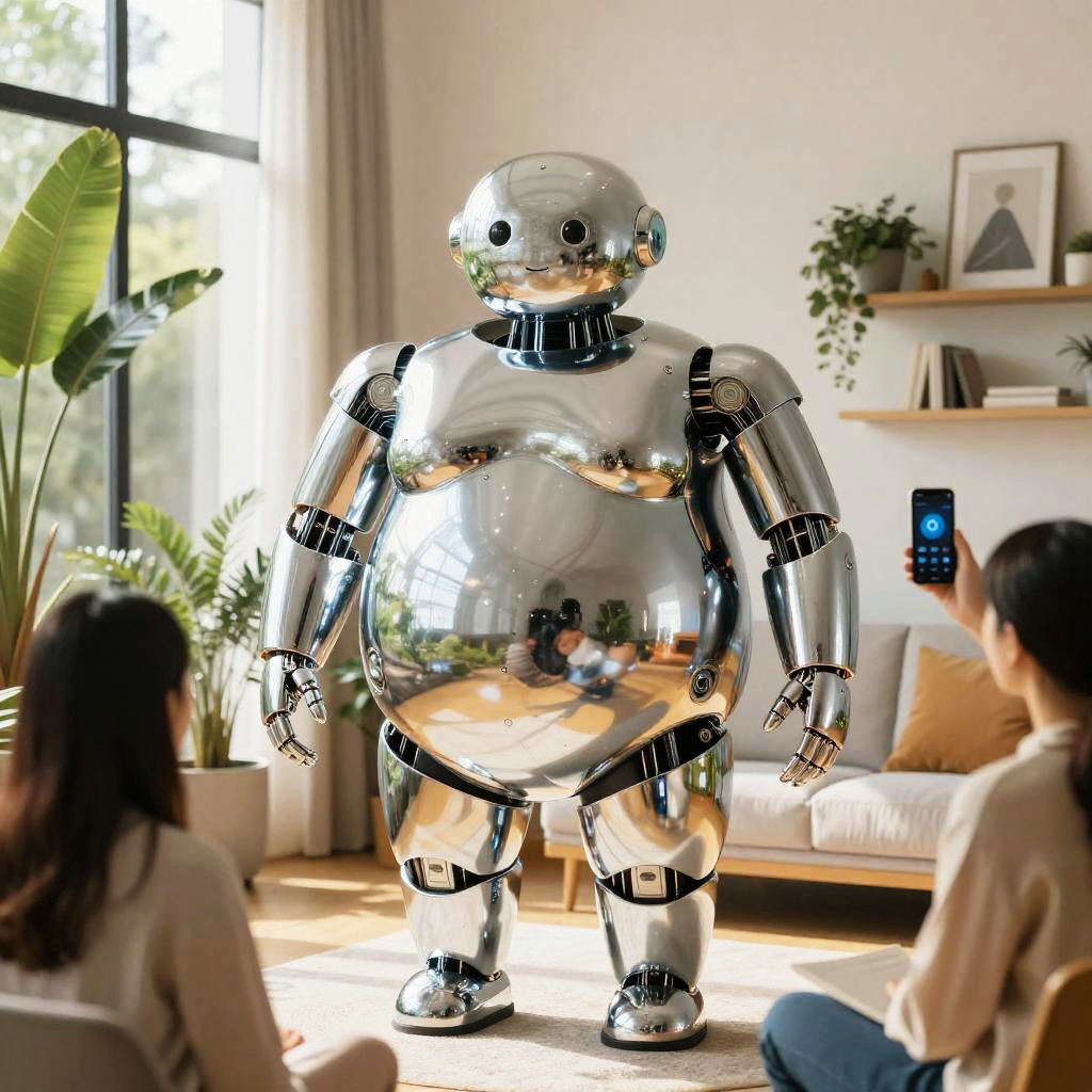 AI fat person, an oversized android with shiny chrome surface and soft, plump features, interacting with humans in a smart home environment, illuminated by natural daylight with lush plants and clean interiors, blending AI technology and comfort lifestyle