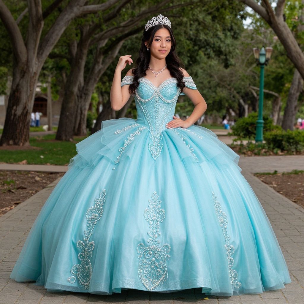 Radiant young woman wearing a stunning Tiffany blue quinceañera gown adorned with intricate pearl embellishments and a voluminous layered skirt, complemented by a sparkling tiara, gracefully posing outdoors in a park setting with trees and a paved path in the background.