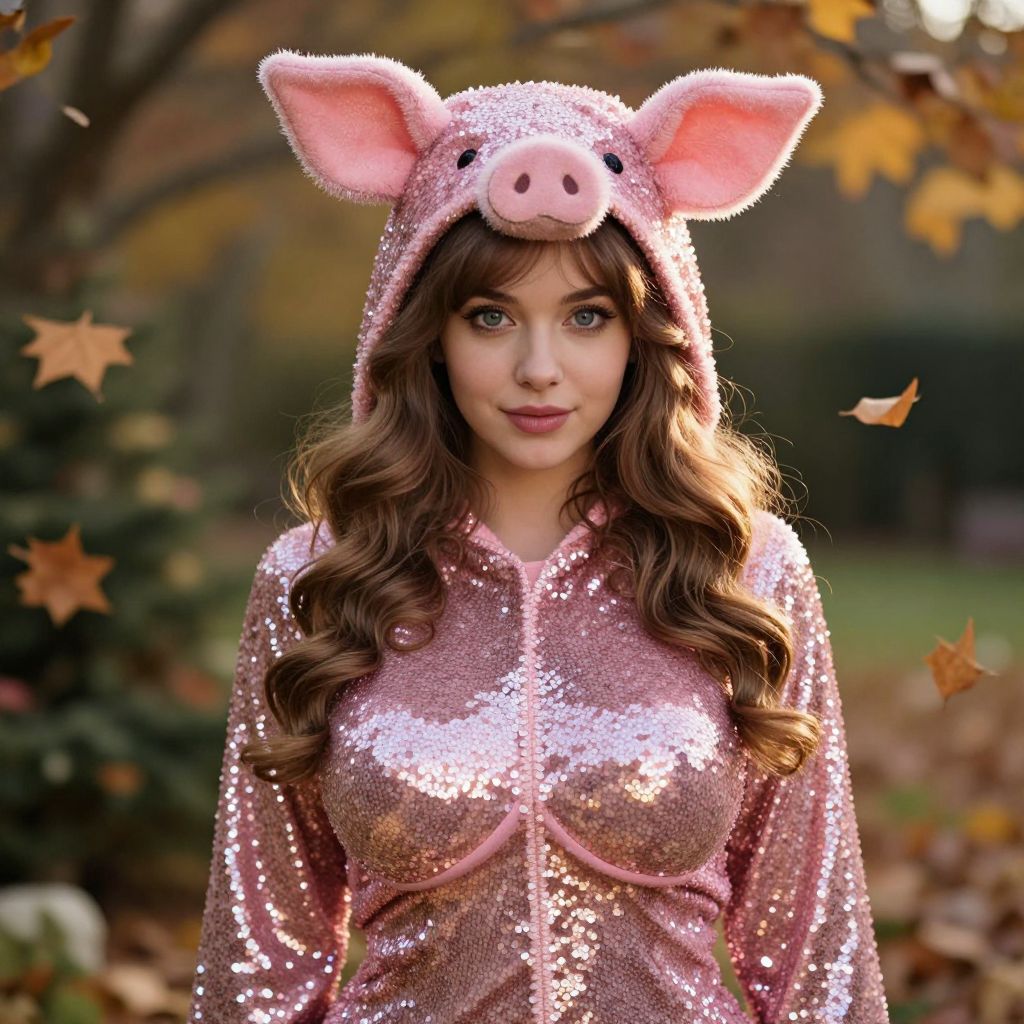 A young woman with long wavy brown hair and soft blue eyes wearing a festive piglet costume featuring a full-body sequined outfit with piglet features: large ears, a stitched nose, and a tiny pink vest, standing in a holiday-themed garden during autumn, leaves falling gently, warm golden hour lighting, detailed and lifelike photograph. The woman has big tits and cute face