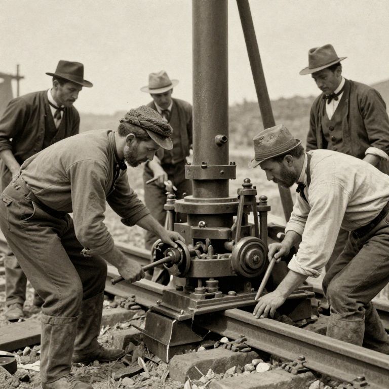 Black-and-white photograph of five male railroad workers in period attire, adjusting a steam-powered jack, focused on a railway track.