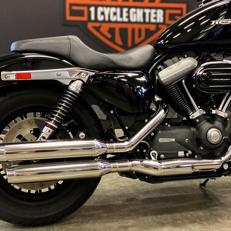 Close-up view of a gleaming 2021 Harley-Davidson Street XL 1200X Forty-Eight motorcycle showcasing its polished chrome exhaust pipes, black leather seat, and intricate suspension components, displayed prominently at #1 Cycle Center Harley-Davidson.