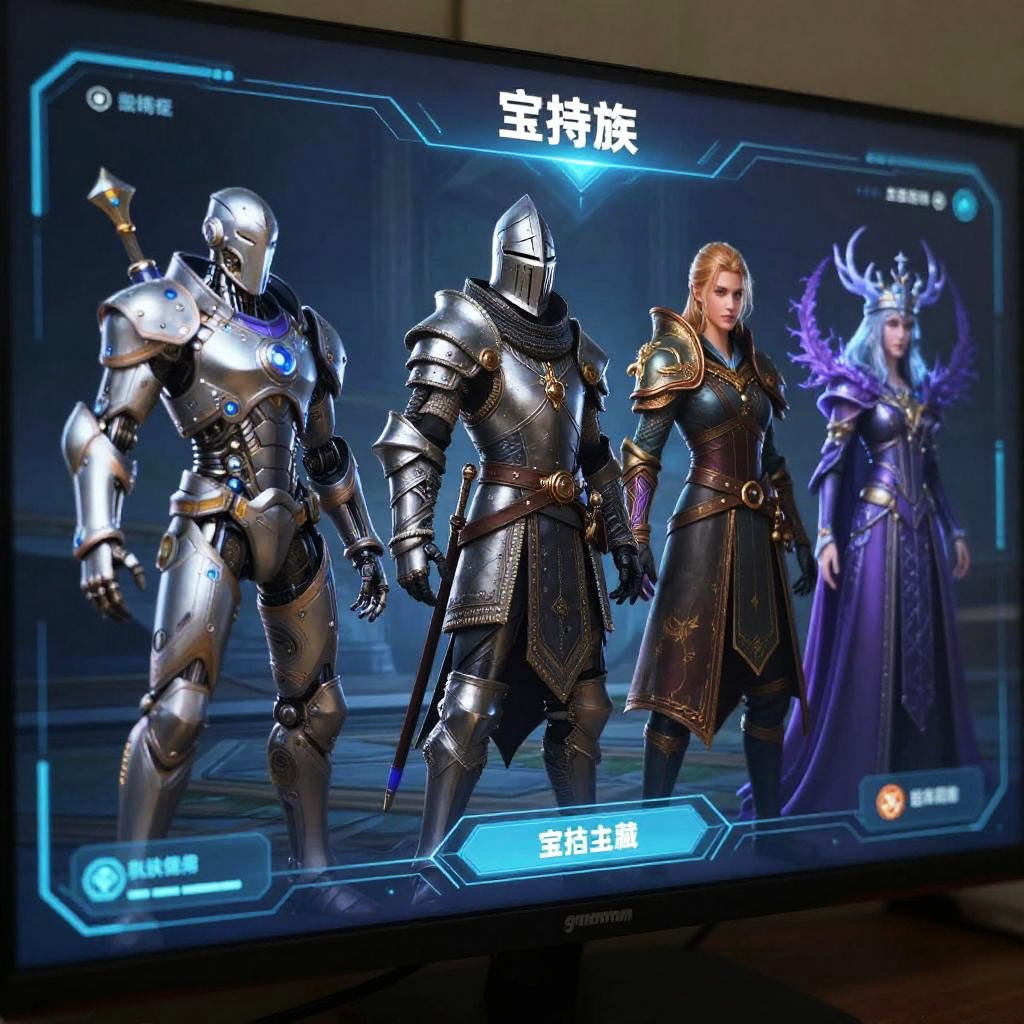 Random video game character generator interface displayed on a holographic screen, showing an array of diverse characters including a cybernetic warrior, a medieval knight, and a mystical mage, highly detailed, intricate textures, futuristic user interface elements.