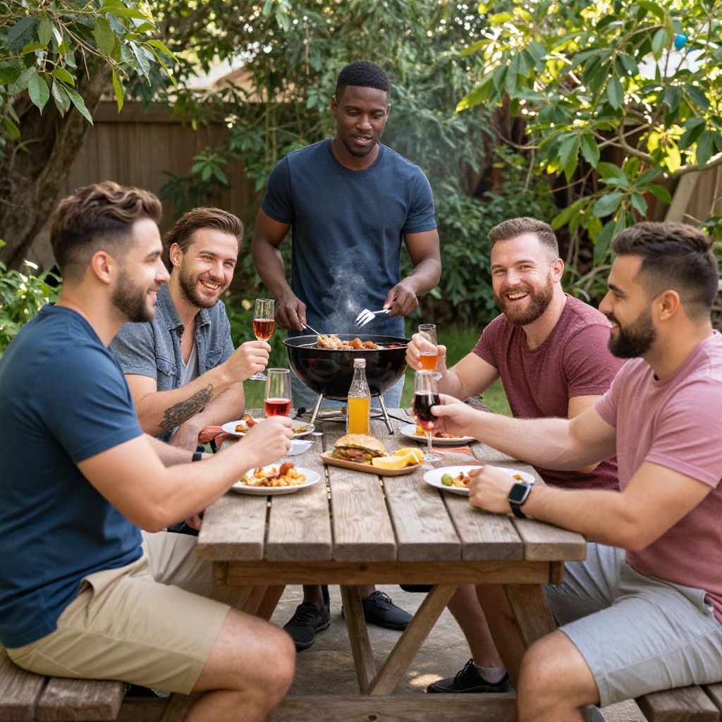 Photograph of six smiling, casually dressed men, diverse in ethnicity, enjoying a backyard BBQ around a wooden table with drinks and food. One man gr