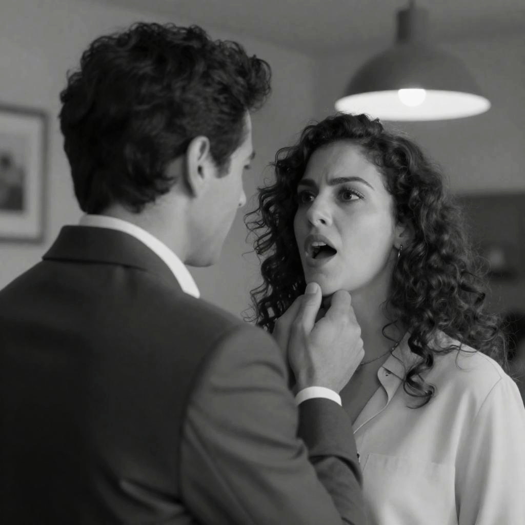 Black-and-white photograph of a man and woman in an intimate close-up. Man with dark hair, thick eyebrows, serious expression, leaning over woman. Woman with curly hair, looking up at man with wide eyes, slightly open mouth. Patterned carpet in background. Man in dark suit, woman in ured jacket, polka-dot blouse. Man's face dominates left, woman's face right. Intense, emotional interaction.