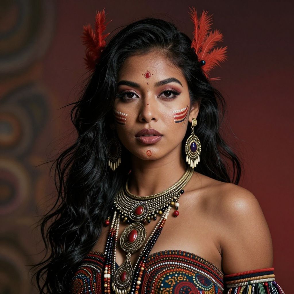 Photograph of a young South Asian woman with long, wavy black hair adorned with red feathers. She has dark brown skin and wears intricate, traditional Indian jewelry including a large, ornate necklace with red gemstones, matching earrings, and a red bindi on her forehead. Her makeup features red and white decorative facial markings. She is dressed in a strapless outfit with a similar red and black beaded pattern. The background is a deep maroon with subtle, circular patterns. Her expression is calm and confident, and she gazes directly at the camera. The image has a vibrant, cultural aesthetic.