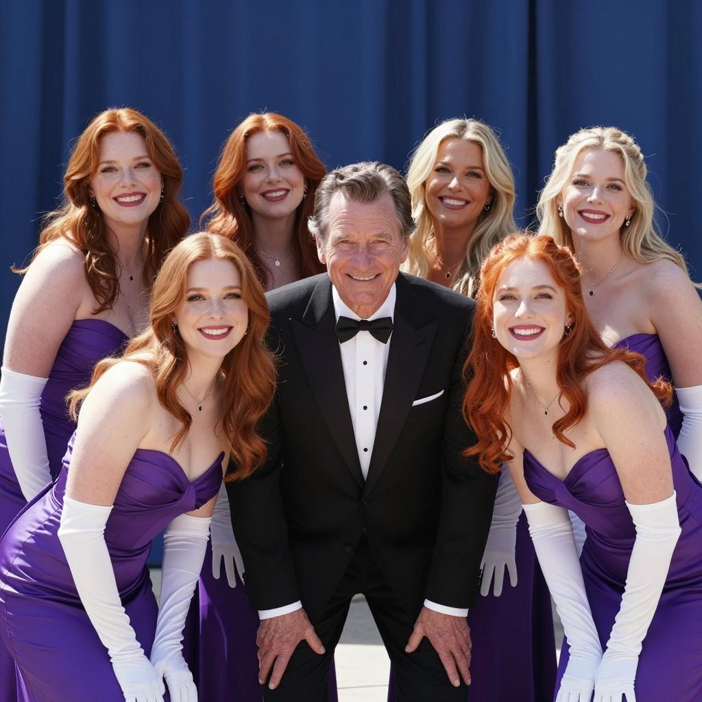Photograph of five people. Five women with red and blonde hair in purple strapless dresses and white gloves, smiling. One older man with dark hair in a black tuxedo, smiling, standing center. Women lean forward, man bends slightly. Blue curtain background. Women's cleavage visible. Bright, sunny lighting.