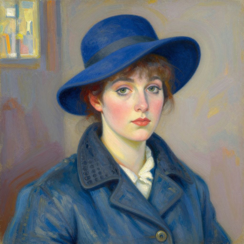 A vibrant digital illustration inspired by William Glackens' style, featuring a woman wearing a bold blue hat and jacket, with soft, impressionistic lighting and a vintage aesthetic.