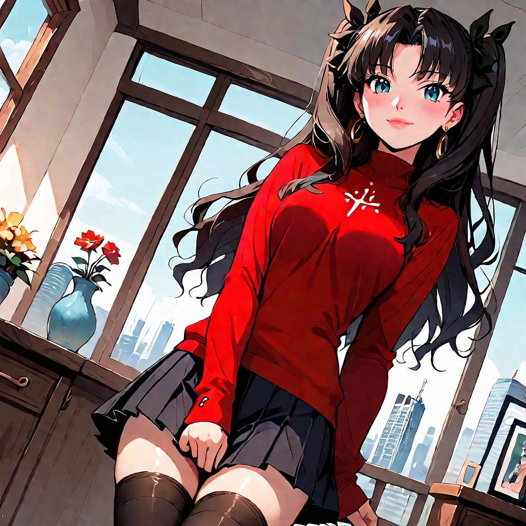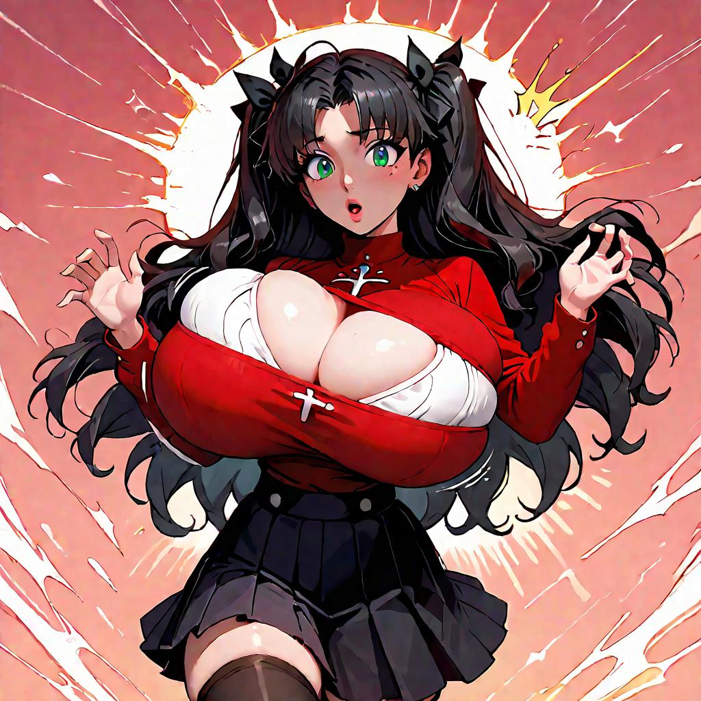 (perfect female body)1.5, 4k, best quality, ultra high res, highly detailed face, anime, (1 girl), (looking at viewer:1.2), (surprised:1.2), (fear:1.4), (facing down:1.2), cleavage, score_9, score_8_up, score_7_up, source_anime, rin tohsaka, aqua eyes, black hair, hair ribbon, long hair, ribbon, sidelocks, two side up, parted bangs, black skirt, black thighhighs, long sleeves, miniskirt, pleated skirt, red sweater, skirt, sweater, thighhighs, turtleneck, (breast expansion), growth, (expansion), pleasure face, boobs popping out, shirt button bursting, bursting breast, motion lines around breast, magic aura around breast, (BETaut, BETorn, skindentation, BESequence, flat chest, small breasts, medium breasts, large breasts, huge breasts, gigantic breasts), (4x4frames)