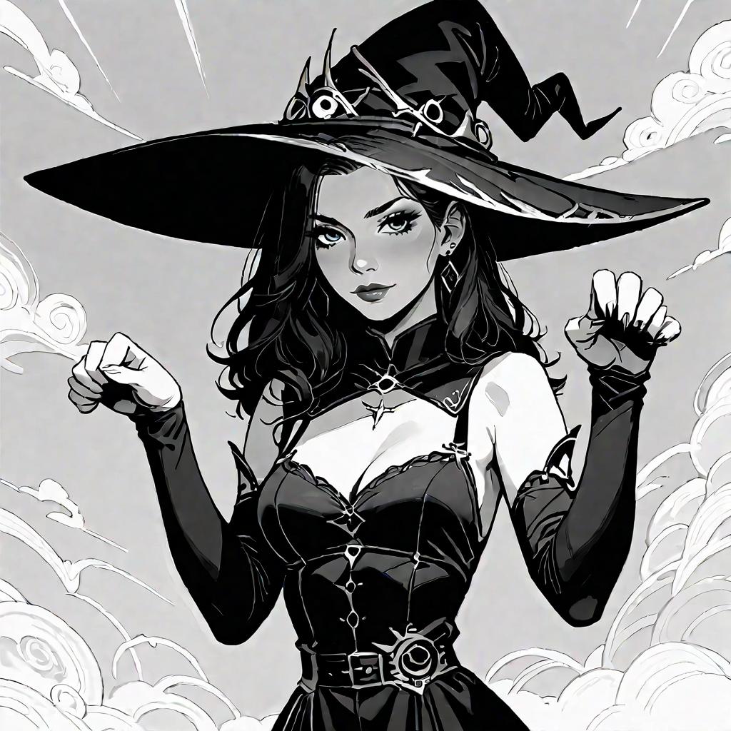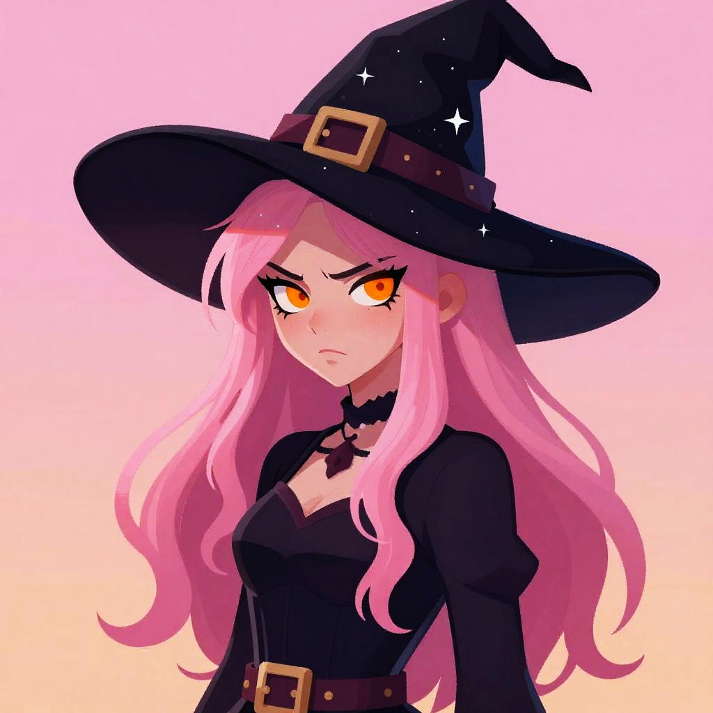 Digital anime-style drawing of a pink-haired witch with long, wavy hair. She has bright orange, angry eyes and a small, determined frown. She wears a large, black, pointed witch hat with a gold buckle and a black choker. Her black dress has long sleeves and a gold buckle belt. The background is a gradient from pink to yellow. Her expression and attire give a confident, slightly defiant look. The art style is vibrant and detailed, with smooth lines and a polished finish.