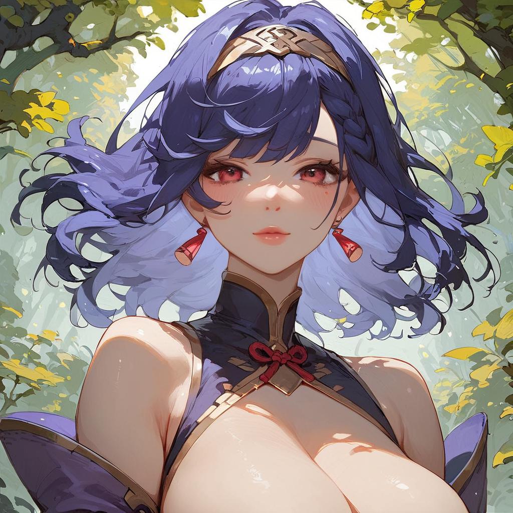 Score_9, score_8_up, score_7_up, score_6_up, source_anime, 1girl, purple hair, red eyes, headband, purple kimono, bare shoulders, breasts, obi, detached sleeves, purple thighhighs, large breasts, forest, blue sky, looking at you, smile, upper body, closed mouth