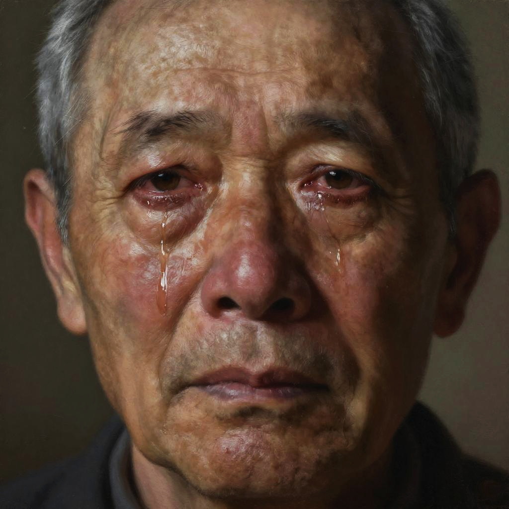 Close-up of a tear streaked face of an elderly man, wrinkles catching light as tears roll down, eyes full of sorrow and wisdom, hyper-realistic painting style, muted earth tones, somber mood, intricate facial details highlighting human fragility.