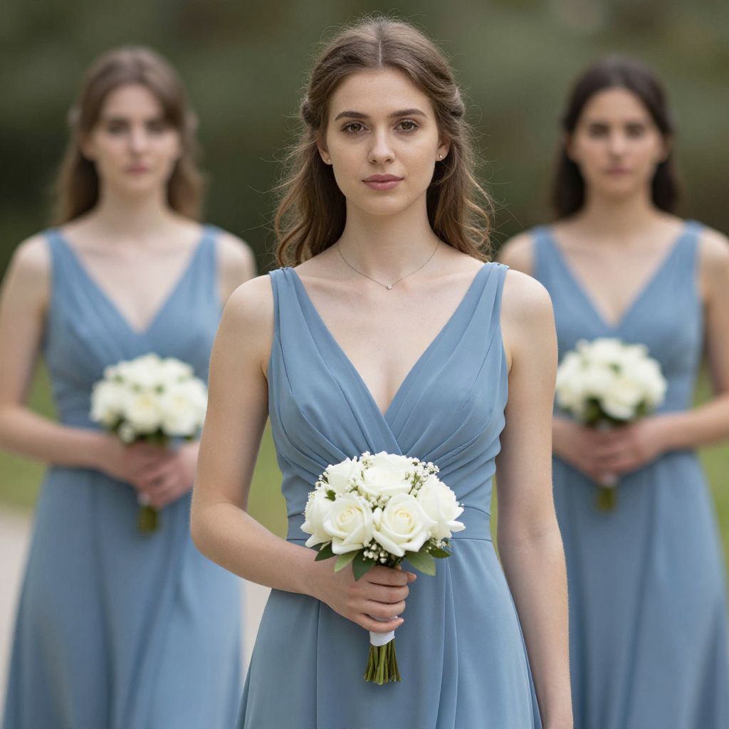 Photograph of three young women standing outdoors in a blurred green background. The central woman has long brown hair, fair skin, and wears a sleeveless, deep V-neck, light blue dress. She holds a small bouquet of white flowers in front of her. Two women in identical dresses stand behind her, slightly out of focus, each holding white flower bouquets. They all have similar fair skin and long brown hair. The dresses are elegant and flowy, and the overall scene conveys a sense of formality and unity.