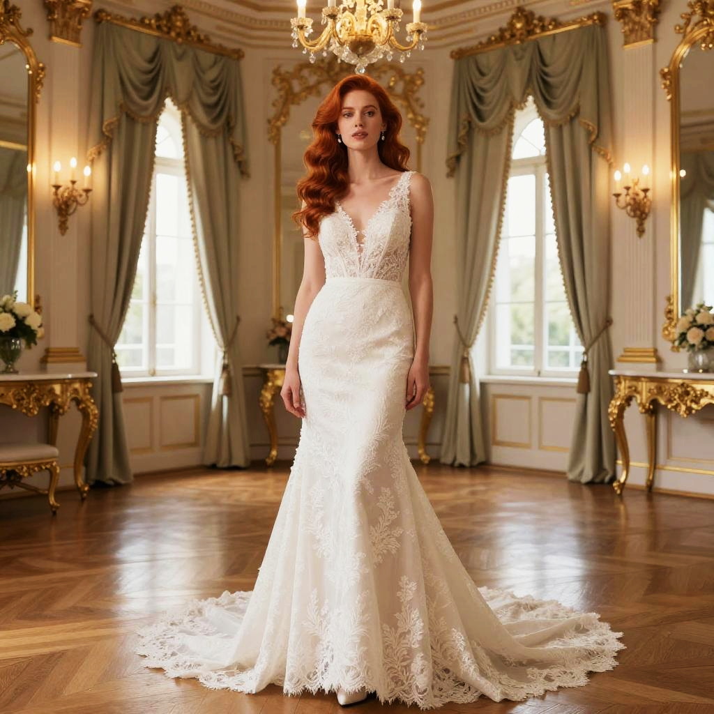 Photograph of a beautiful woman with long, wavy brown hair, wearing a white lace long-sleeve wedding dress that hugs her curvy figure. She has dramatic, smoky eye makeup and nude lipstick, looking directly at the camera with a confident expression. The background features ornate, cream-colored wall panels. Her right hand is gently touching her hair, adding a touch of elegance.