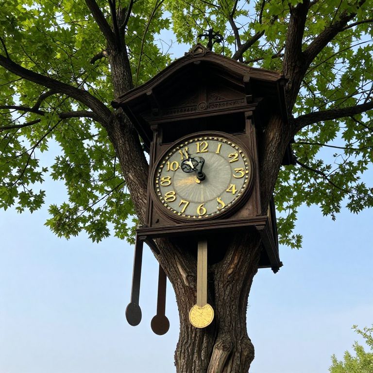 An ancient clocktower growing organically from a tree’s heartwood, with branches acting as pendulums and leaves displaying ever-shifting numerals in gold.