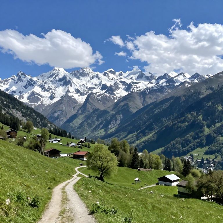 This is a vivid photograph of a mountain landscape. Snow-capped peaks dominate the background under a bright blue sky with scattered clouds. The midground features a lush green valley with a few scattered houses and trees. The foreground shows a small, winding dirt path bordered by greenery. The scene is peaceful and picturesque, capturing the natural beauty of the mountains.